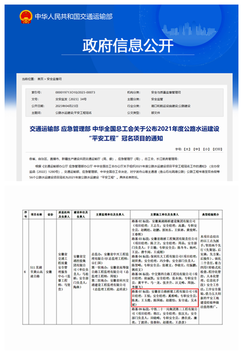 4月23日,交通運輸部、應急管理部、中華全國總工會公布了2021年度公路水運建設“平安工程”冠名項目名單,公司參建的蕪黃高速項目榮獲2021年度全國公路水運建設“平安工程”冠名,在全國40個獲獎公路項目中排名第6,被作為10個經(jīng)驗典型項目之一全國推廣,也是安徽省唯一獲得該獎項的公路工程項目。