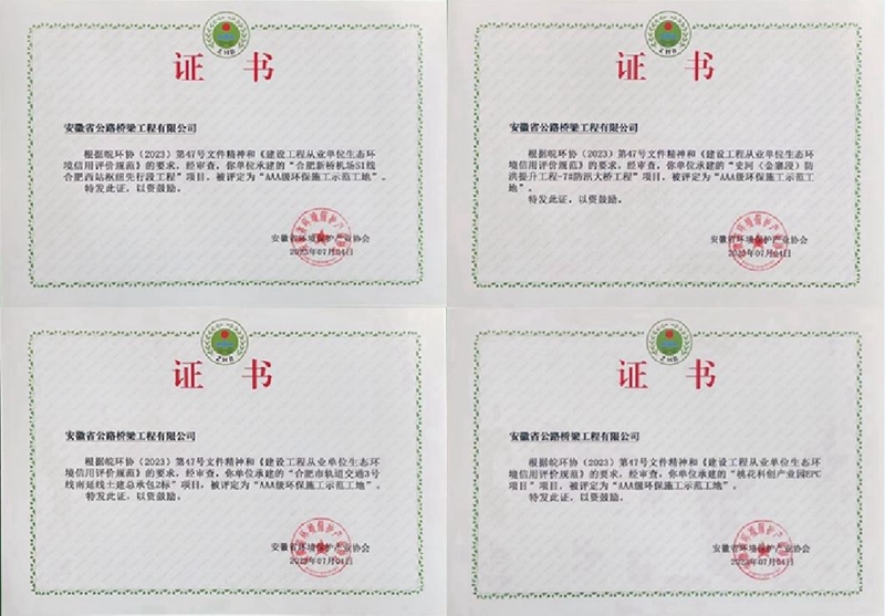 近日,公司承建的桃花科創(chuàng)產(chǎn)業(yè)園EPC項目、史河(金寨段)防洪提升工程-7#防汛大橋項目、合肥新橋機場S1線先行段項目、合肥軌道3號線南延2標項目獲評安徽省環(huán)境保護產(chǎn)業(yè)協(xié)會“AAA級環(huán)保施工示范工地”稱號。