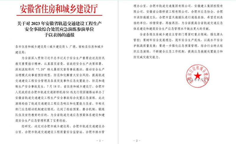 近日,安徽省住房和城鄉(xiāng)建設(shè)廳發(fā)文通報(bào)表?yè)P(yáng)安徽建工集團(tuán)控股有限公司、安徽省公路橋梁工程有限公司在2023年度安徽省軌道交通建設(shè)工程綜合處置應(yīng)急演練中所作出的突出貢獻(xiàn)和優(yōu)異表現(xiàn)。