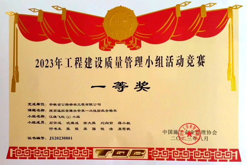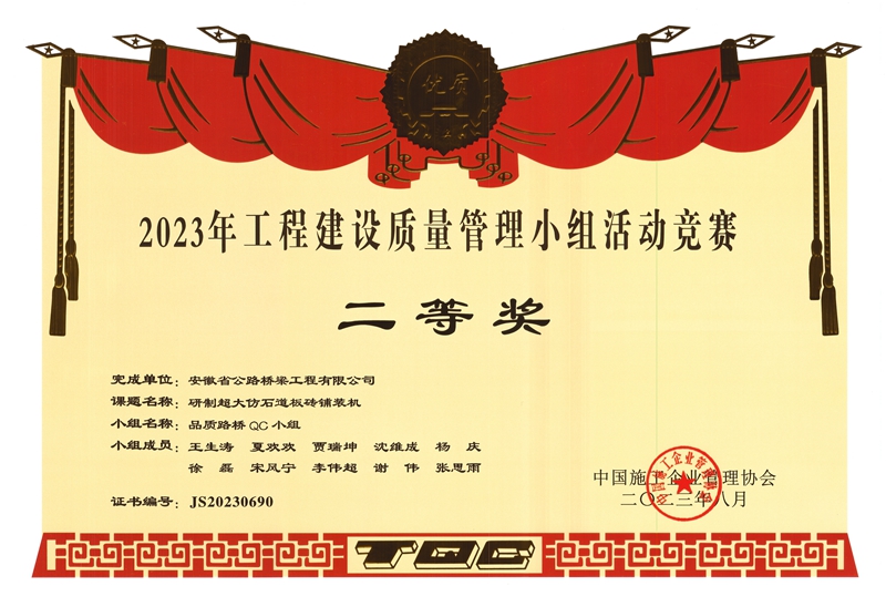 8月11日,中國施工企業(yè)管理協(xié)會“2023年(首屆)工程建設(shè)行業(yè)質(zhì)量管理小組活動高質(zhì)量發(fā)展大會”在山西太原順利閉幕。會議對各地區(qū)及行業(yè)協(xié)會推薦的1468個優(yōu)秀QC成果進行了集中發(fā)布,其中橋梁分公司申報的QC成果《提高溫控管接頭安裝一次性驗收合格率》榮獲一等獎,市政分公司申報的QC成果《提高地下車庫地坪施工合格率》《研制超大仿石道板磚鋪裝機》榮獲二等獎。