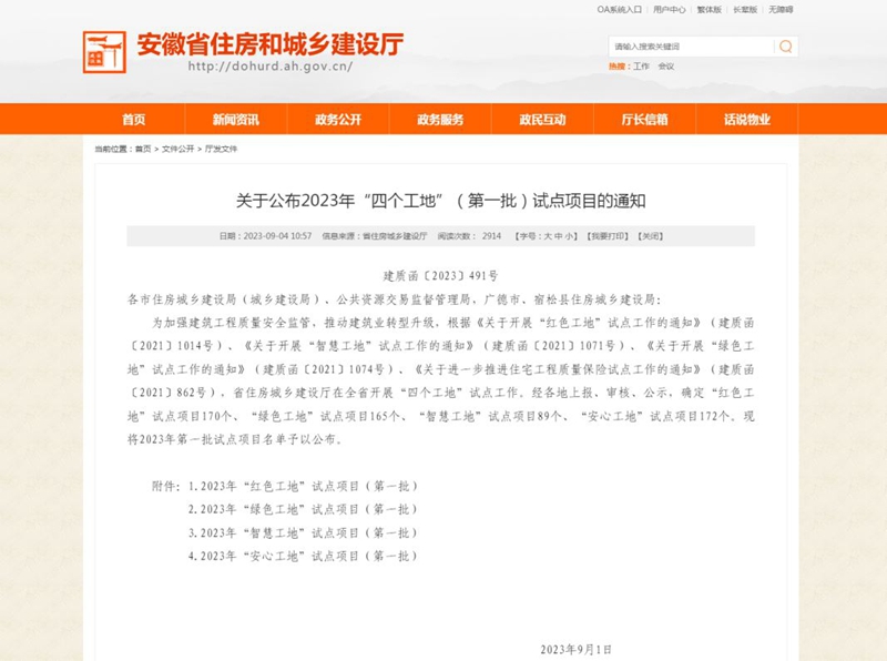 公司多個項(xiàng)目獲評安徽省住建廳2023年首批“四個工地”試點(diǎn)項(xiàng)目稱號
