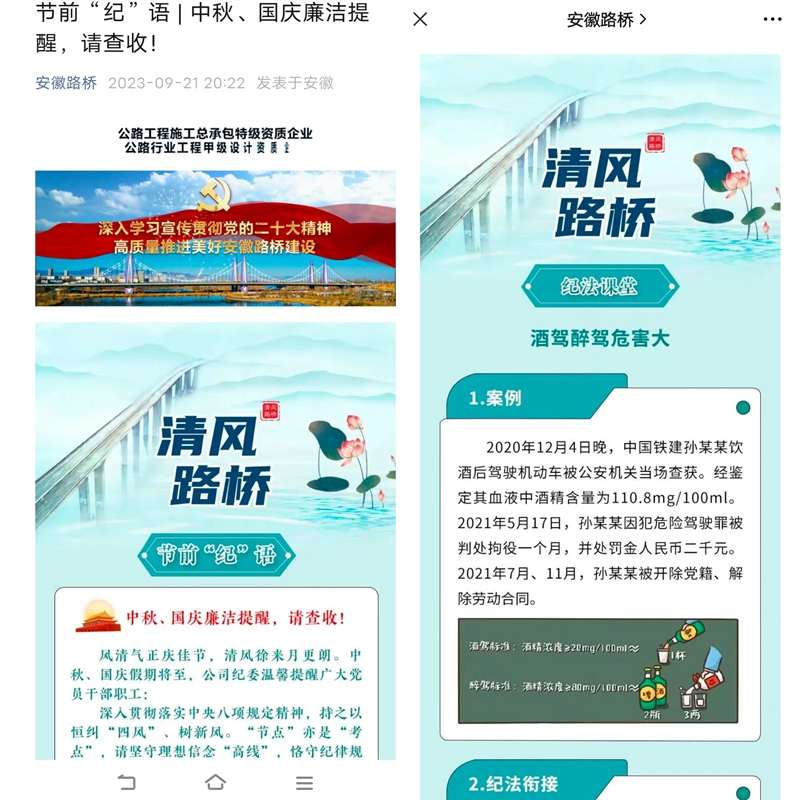 9月,公司陸續(xù)推出《紀(jì)法課堂|酒駕醉駕危害大》、《節(jié)前“紀(jì)”語|中秋、國慶廉潔提醒》,并組織學(xué)習(xí)中紀(jì)委、省紀(jì)委近期公開曝光的違反中央八項(xiàng)規(guī)定精神問題典型案例,向全體黨員干部發(fā)送廉潔過節(jié)提醒短信。中秋、國慶前,公司紀(jì)委通過微信公眾號、手機(jī)短信等形式密集推送廉潔提醒信息,重申節(jié)日紀(jì)律要求,做實(shí)作風(fēng)建設(shè)思想和紀(jì)律教育,早打招呼、早提醒。引導(dǎo)帶動(dòng)各級黨組織通過“三會一課”、主題黨日等,把全面從嚴(yán)治黨、加強(qiáng)節(jié)點(diǎn)作風(fēng)建設(shè)要求傳達(dá)到每一名黨員干部。市政分公司組織赴包公故里文化園開展“筑防線葆廉潔本色 揚(yáng)正氣創(chuàng)清風(fēng)路橋”主題黨日活動(dòng);橋梁分公司、軌道分公司逐級對關(guān)鍵崗位人員開展廉潔從業(yè)談心談話,持續(xù)提高黨員干部紀(jì)律規(guī)矩意識。時(shí)刻繃緊紀(jì)律規(guī)矩之弦,對標(biāo)作風(fēng)建設(shè)紀(jì)律規(guī)矩檢視律己,守紀(jì)律、知敬畏、過“廉”節(jié)。