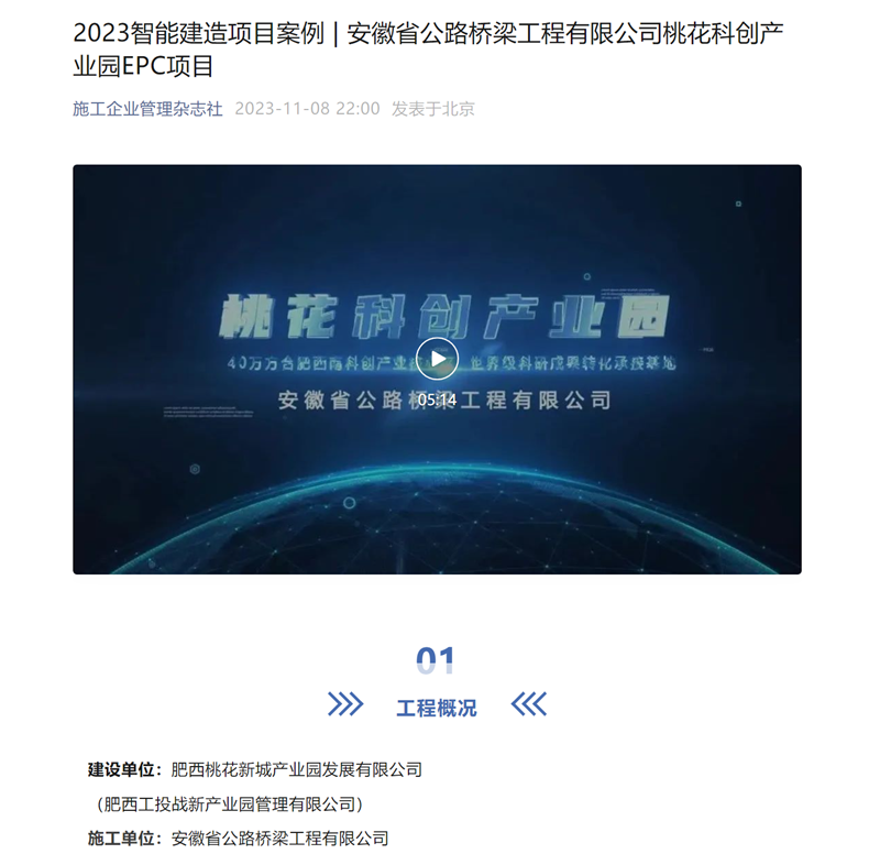 近日,從施工企業(yè)管理雜志社傳來喜訊,桃花科創(chuàng)產業(yè)園項目入選施工企業(yè)管理雜志社2023智能建造項目案例,同步對案例進行了專題介紹。