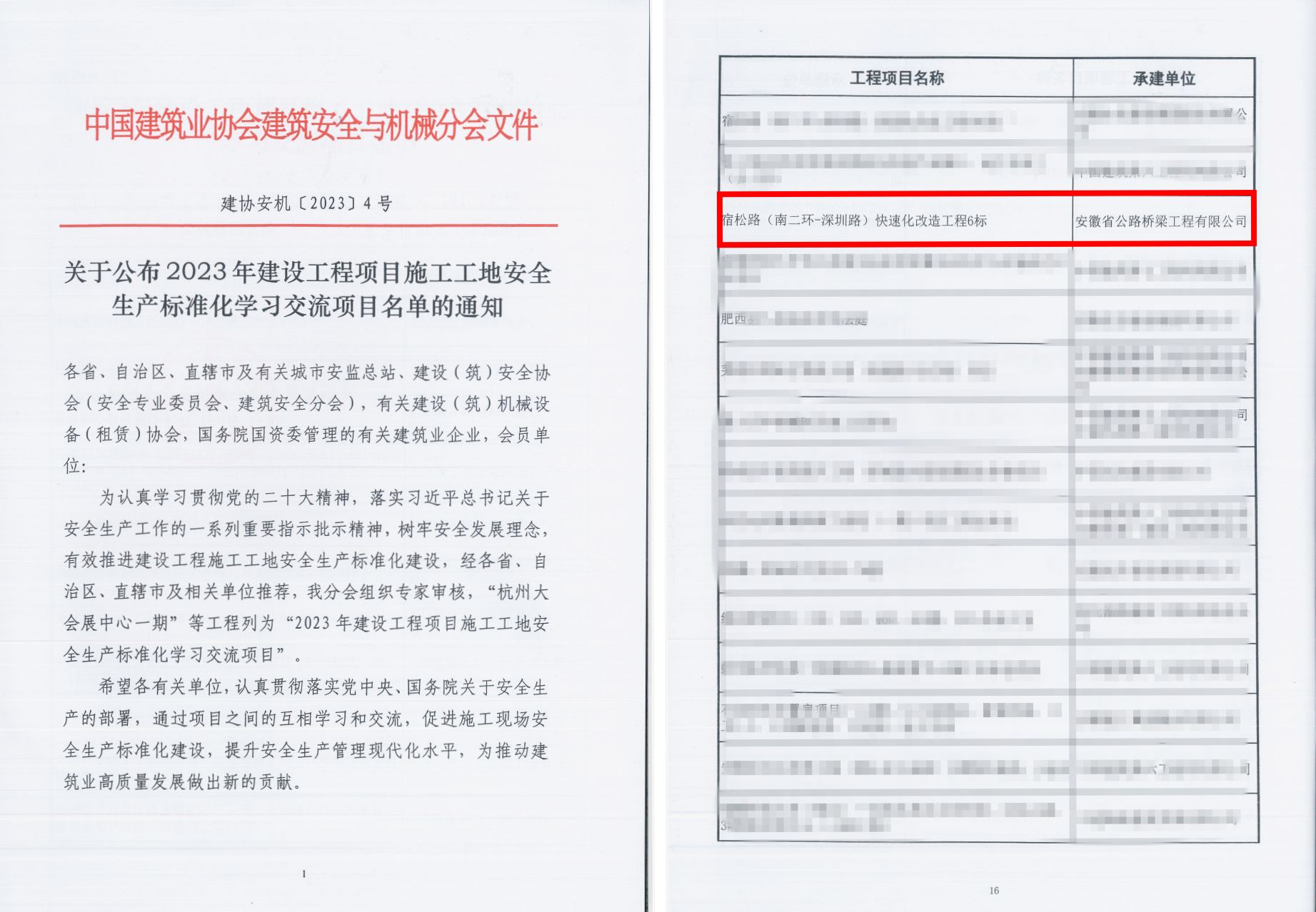 近日,中國建筑業(yè)協(xié)會公布2023年建設(shè)工程項(xiàng)目施工工地安全生產(chǎn)標(biāo)準(zhǔn)化學(xué)習(xí)交流項(xiàng)目(原全國AAA安全文明標(biāo)準(zhǔn)化工地)名單,公司承建的宿松路(南二環(huán)-深圳路)快速化改造工程6標(biāo)段榜上有名。