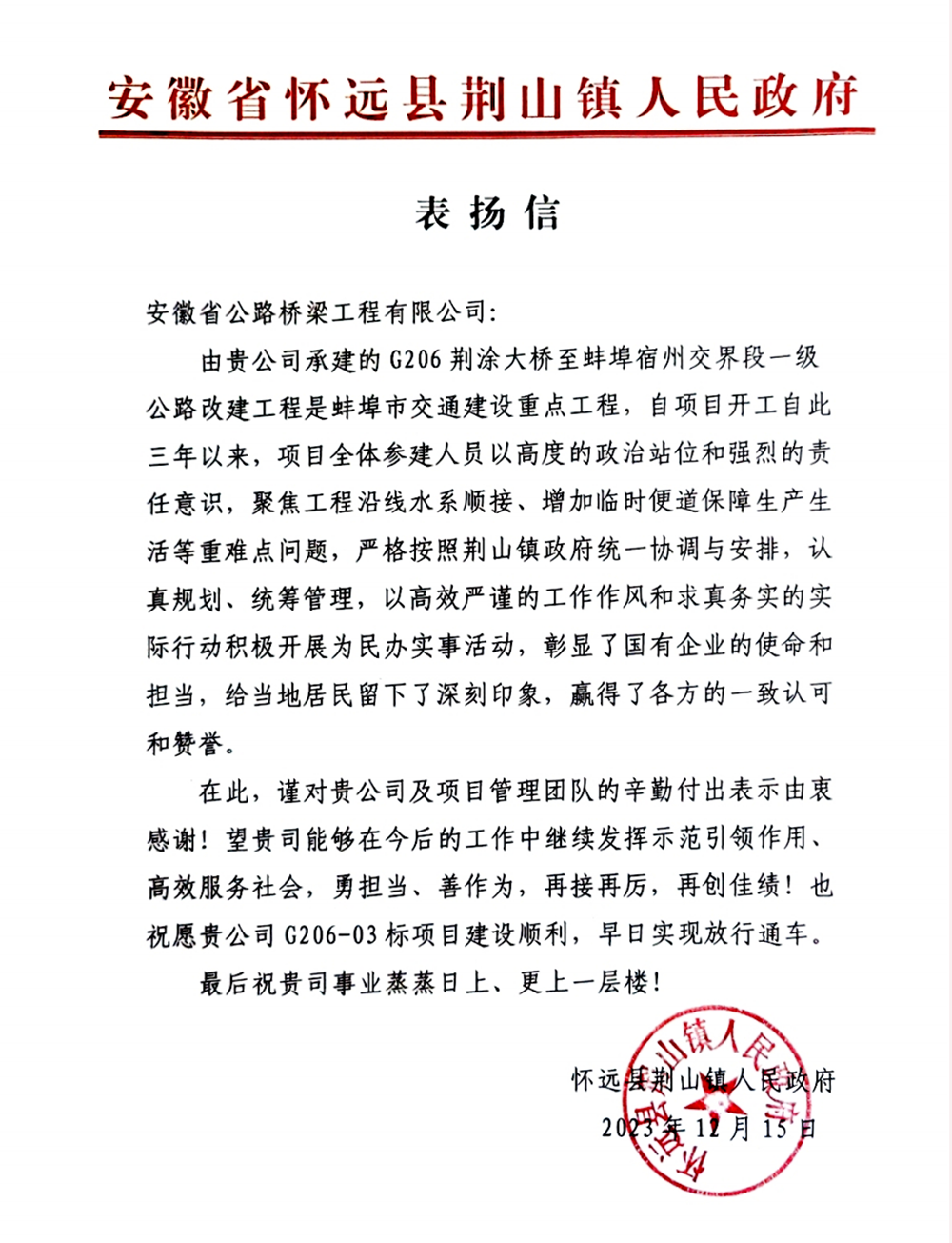 懷遠縣荊山鎮(zhèn)人民政府來信表示,G206荊涂大橋蚌埠至宿州交界段一級公路改建工程03標項目全體參建人員積極與政府協(xié)調(diào)配合,推動項目高質(zhì)量建設(shè),以實際行動積極開展為群眾辦實事活動,踐行了國企擔當。