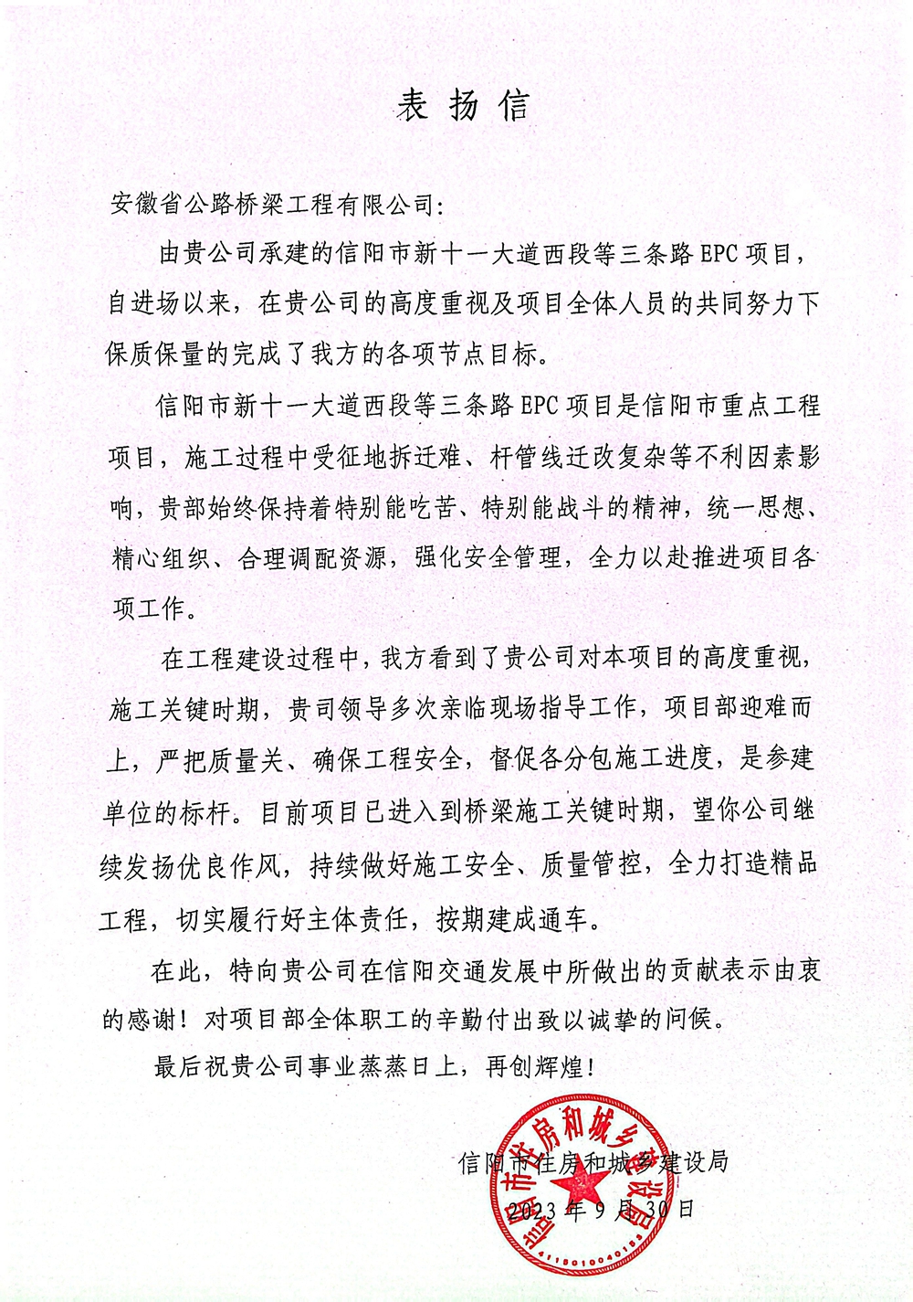 信陽市住房和城鄉(xiāng)建設(shè)局來信指出,信陽新十一大道項目在施工過程中克服征地拆遷難、桿管線遷改復雜等不利因素影響,始終發(fā)揚“特別能吃苦、特別能戰(zhàn)斗”的企業(yè)作風,嚴把質(zhì)量關(guān)、安全關(guān),高質(zhì)高效推進項目建設(shè),為信陽交通發(fā)展做出了突出貢獻。