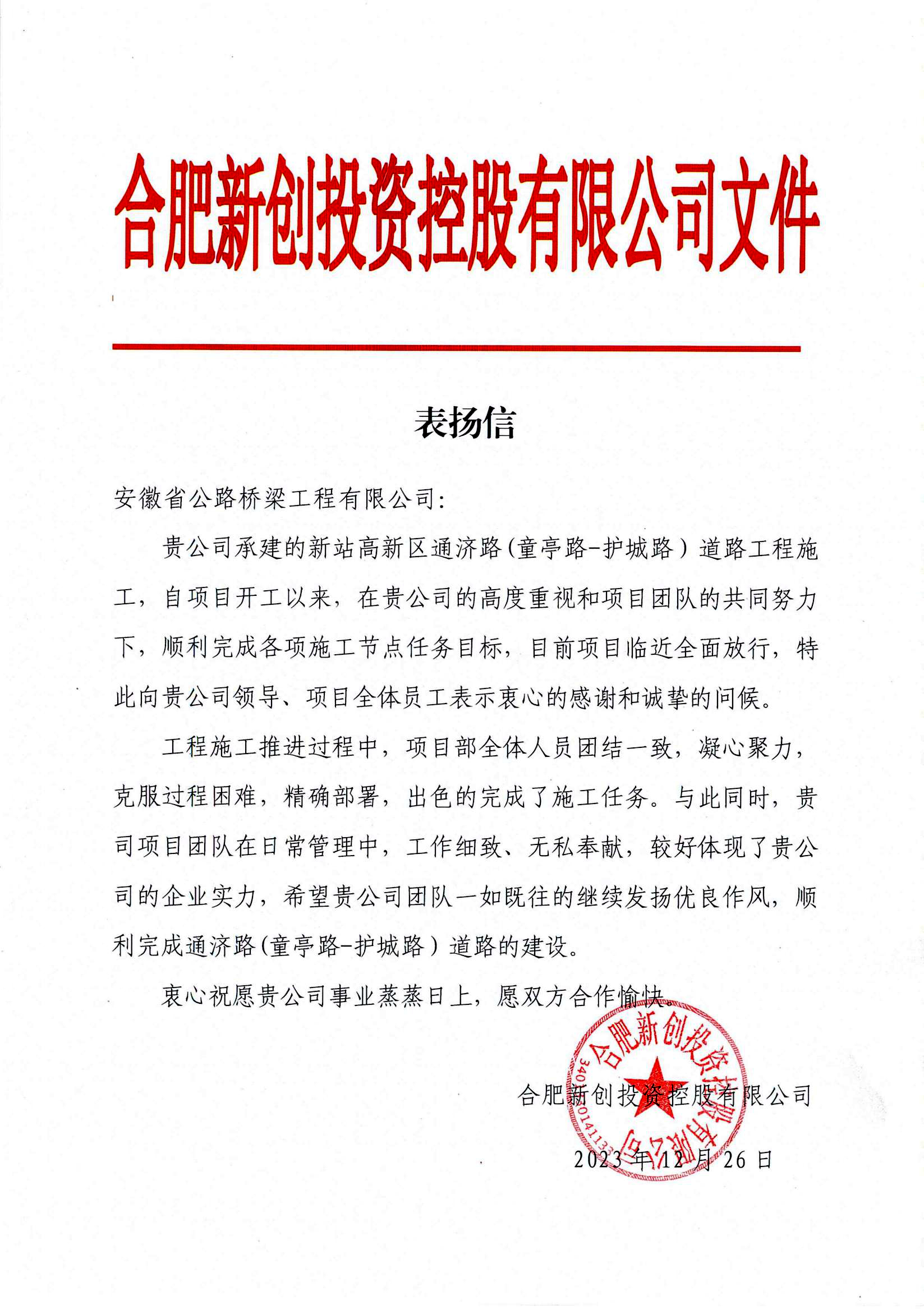 合肥新創(chuàng)投資控股有限公司來信表示,新站高新區(qū)通濟(jì)路(童亭路-護(hù)城路)道路工程施工推進(jìn)過程中,項目團(tuán)隊發(fā)揚(yáng)路橋鐵軍優(yōu)良作風(fēng),咬定目標(biāo)攻堅克難,持續(xù)加強(qiáng)現(xiàn)場安全文明施工和質(zhì)量管理,圓滿完成各項施工任務(wù),彰顯了國企腳踏實地、久久為功的擔(dān)當(dāng)作風(fēng)。