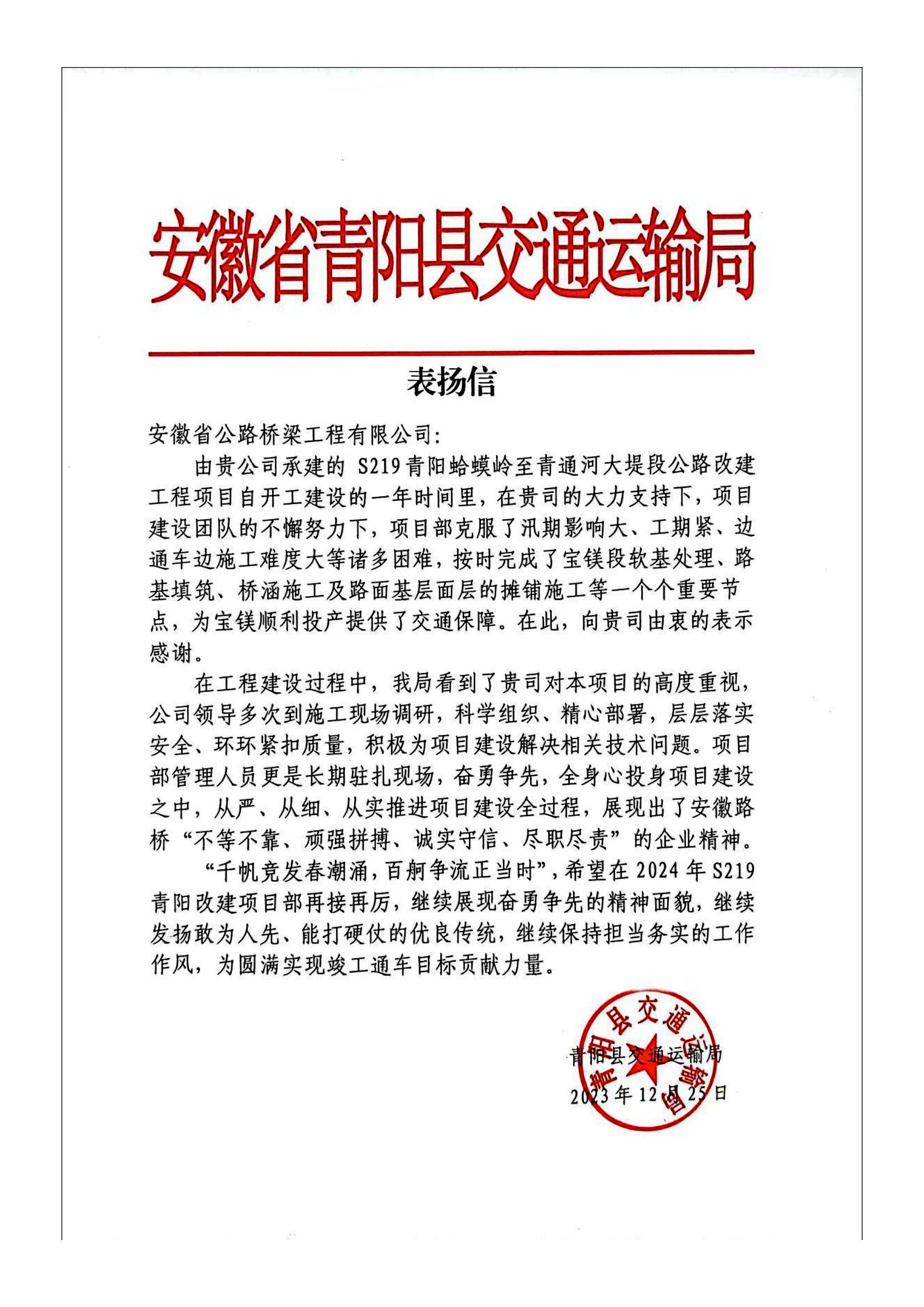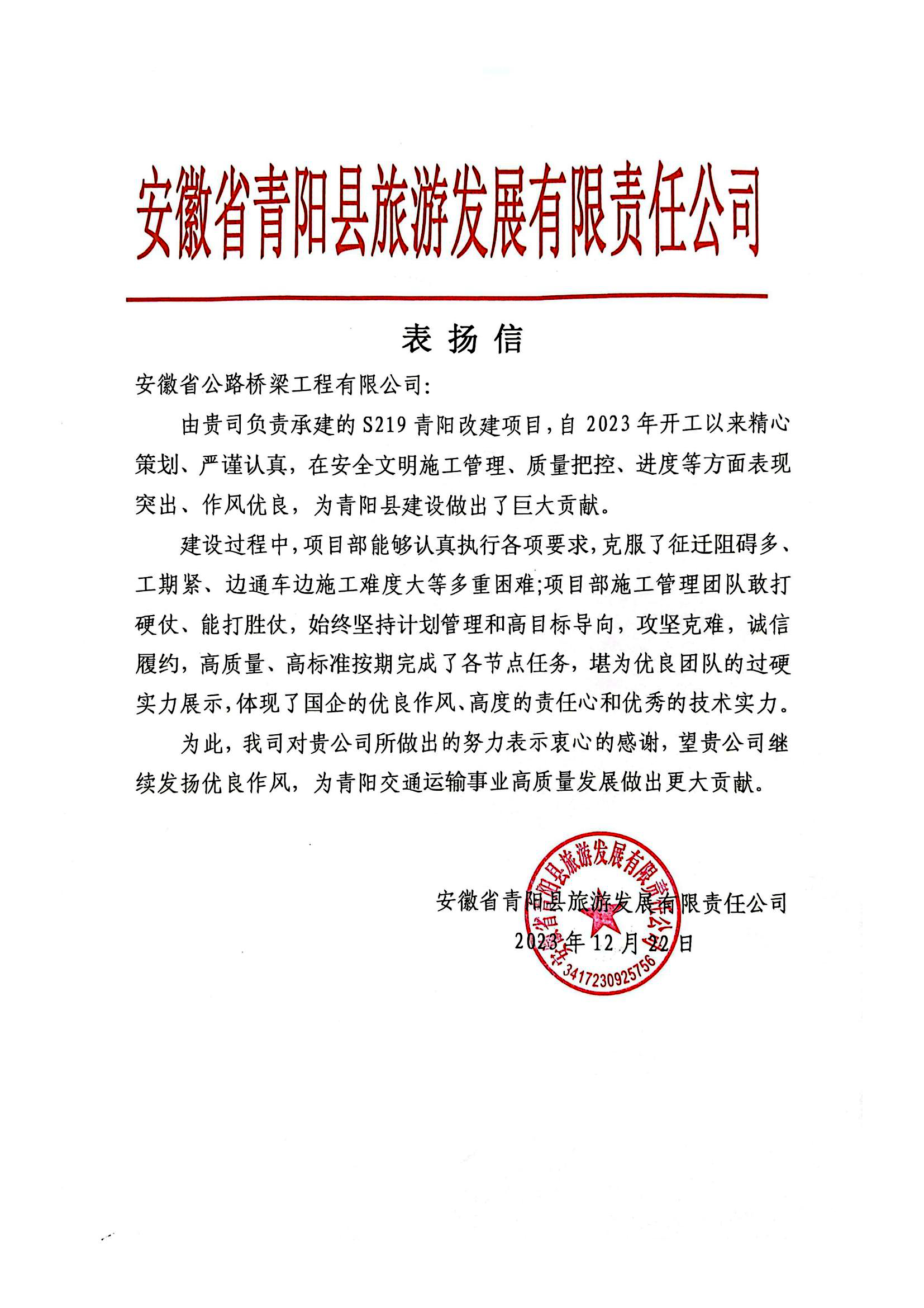 安徽省青陽縣交通運(yùn)輸局和青陽縣旅游發(fā)展有限公司來信指出,S219青陽蛤蟆嶺至青通河大堤段公路改建工程項目建設(shè)過程中,項目施工管理團(tuán)隊克服了汛期影響大、工期緊、邊通車邊施工難度大等諸多困難,高質(zhì)量、高標(biāo)準(zhǔn)按期完成了各節(jié)點任務(wù),為青陽交通運(yùn)輸事業(yè)高質(zhì)量發(fā)展做出了巨大貢獻(xiàn)。