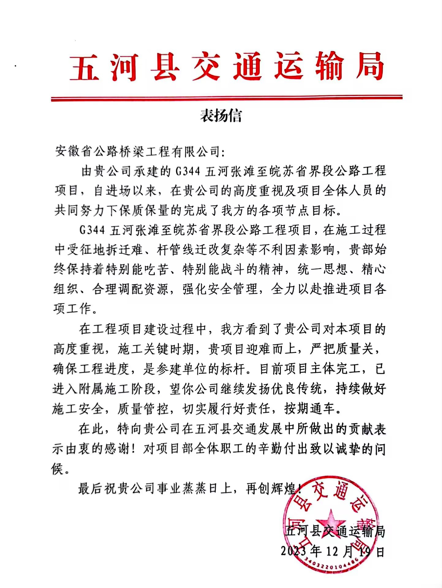 五河縣交通運(yùn)輸局來信指出,G344五河張灘至皖蘇省界段公路工程自進(jìn)場以來,項目全體參建人員統(tǒng)一思想、精心組織、合理調(diào)配資源,克服了征地拆遷難、桿管線遷改復(fù)雜等不利因素影響,保質(zhì)保量地完成了各項節(jié)點目標(biāo),是全線參建單位的標(biāo)桿。