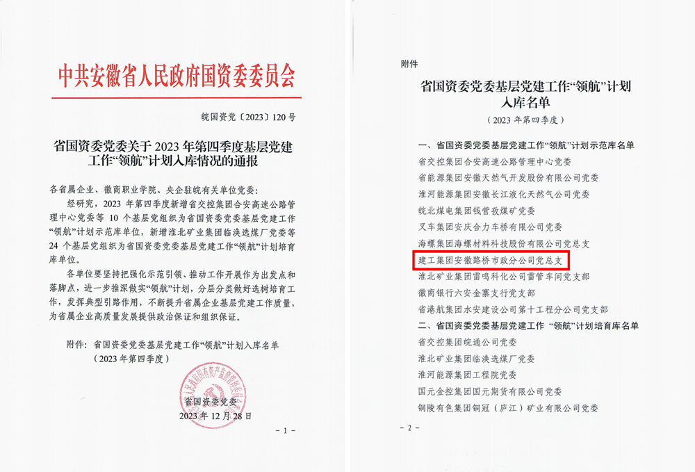 近日,安徽省國資委發(fā)布《關(guān)于2023年第四季度基層黨建工作“領航”計劃入庫情況的通報》,安徽路橋市政分公司黨總支成功入選省國資委黨委基層黨建工作“領航”計劃示范庫。
