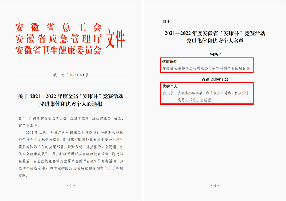 近日,安徽省總工會、安徽省應(yīng)急管理廳、安徽省衛(wèi)生健康委員會印發(fā)《關(guān)于2021-2022年度全省“安康杯”競賽活動先進(jìn)集體和優(yōu)秀個人的通報》,市政分公司桃花科創(chuàng)產(chǎn)業(yè)園項(xiàng)目部獲評“優(yōu)勝班組”,道路分公司黨總支書記、總經(jīng)理張慶書獲評“優(yōu)秀個人”。