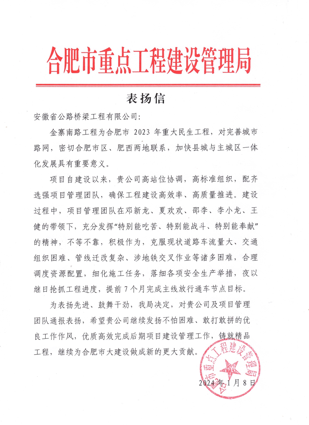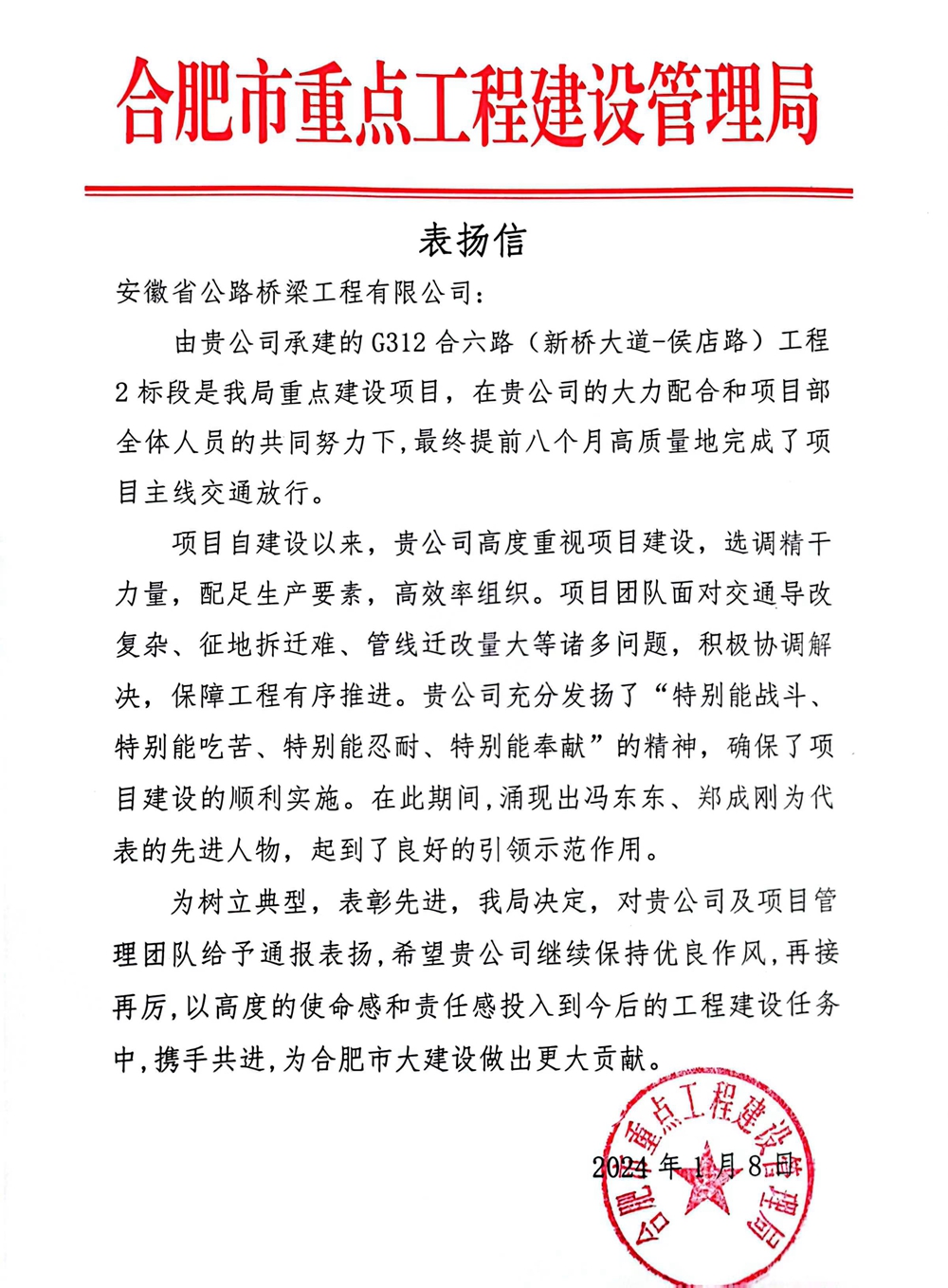 近日,公司承建的G312合六路(新橋大道-侯店路)工程2標(biāo)、金寨南路快速化改造(望水路-站前路)項(xiàng)目、金寨南路快速化改造工程(站前路—深圳路)1標(biāo)項(xiàng)目收到合肥市重點(diǎn)局來信表揚(yáng)。