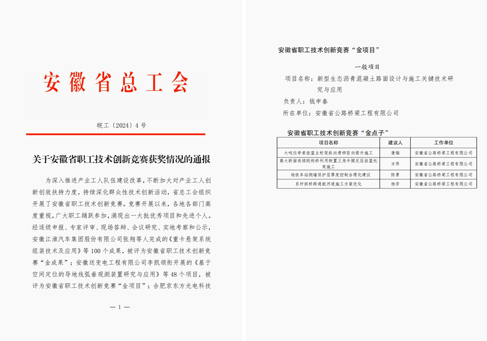 近日,安徽省總工會發(fā)布《關于安徽省職工技術創(chuàng)新競賽獲獎情況的通報》,公司報送的《新型生態(tài)瀝青混凝土路面設計與施工關鍵技術研究與應用》獲評“金項目”,《大噸位牽索掛籃主桁架縱向滑移豎向提升施工》等4項建議獲評“金點子”。