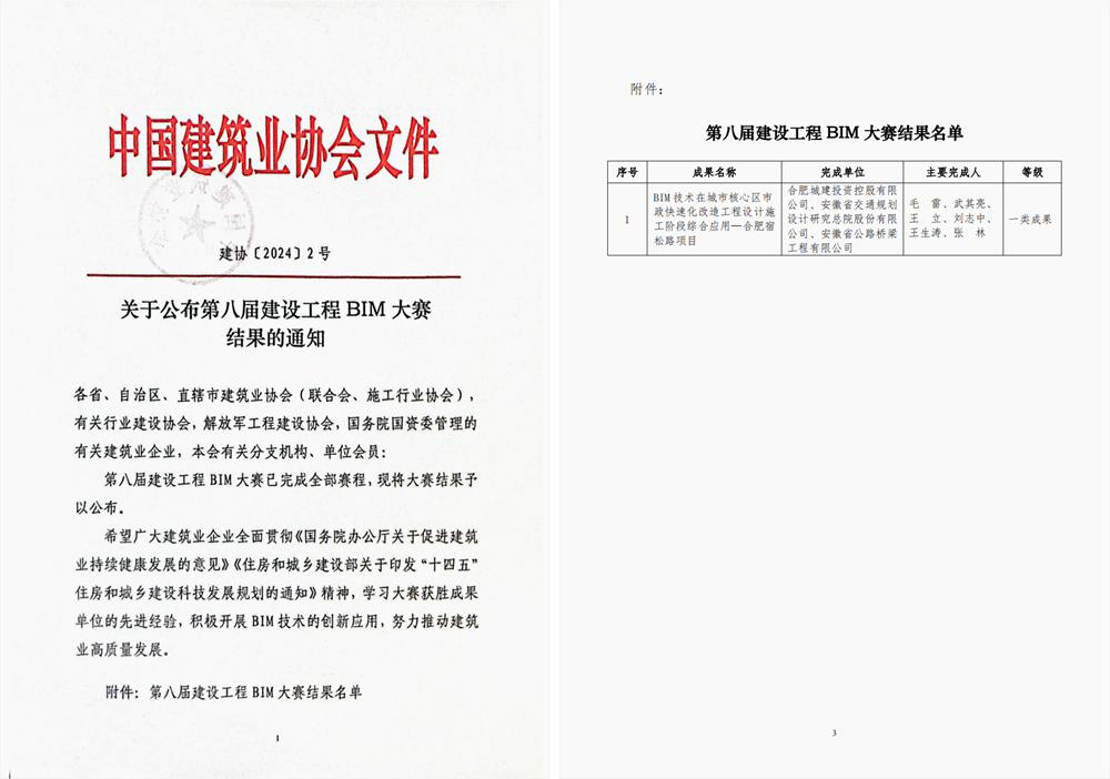 1月23日,中國建筑業(yè)協(xié)會發(fā)布了《關(guān)于公布第八屆建設(shè)工程BIM大賽結(jié)果的通知》,公司承建的宿松路6標項目報送的“BIM技術(shù)在城市核心區(qū)市政快速化改造工程設(shè)計施工階段綜合應用—合肥宿松路項目”榮獲一類成果。