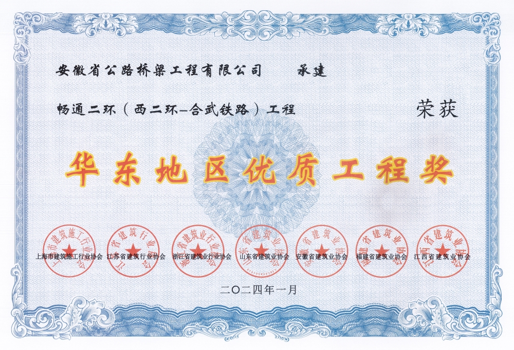 近日,由公司承建的暢通二環(huán)(西二環(huán)-合武鐵路)工程獲得華東地區(qū)優(yōu)質(zhì)工程獎(jiǎng),至此,公司已奪得7項(xiàng)華東地區(qū)優(yōu)質(zhì)工程獎(jiǎng)。