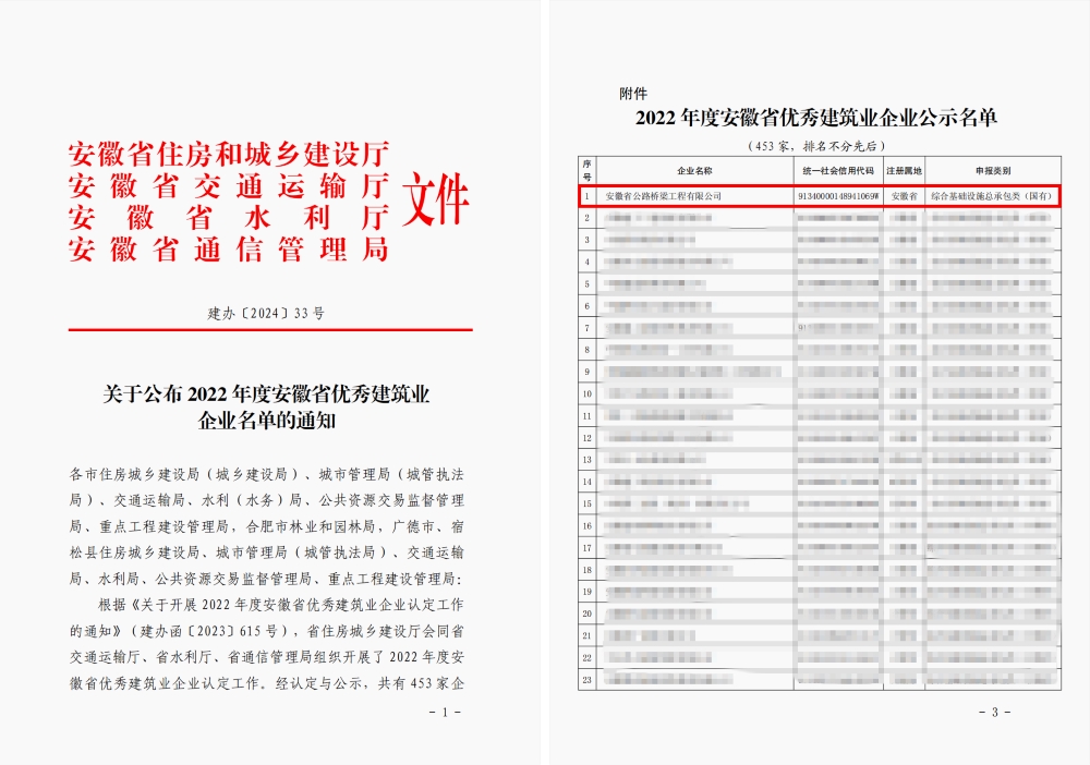 近日,安徽省住房和城鄉(xiāng)建設(shè)廳、安徽省交通運輸廳、安徽省水利廳、安徽省通信管理局聯(lián)合公布了“2022年度安徽省優(yōu)秀建筑業(yè)企業(yè)”名單,公司連續(xù)三年以綜合基礎(chǔ)設(shè)施總承包類別成功入選。