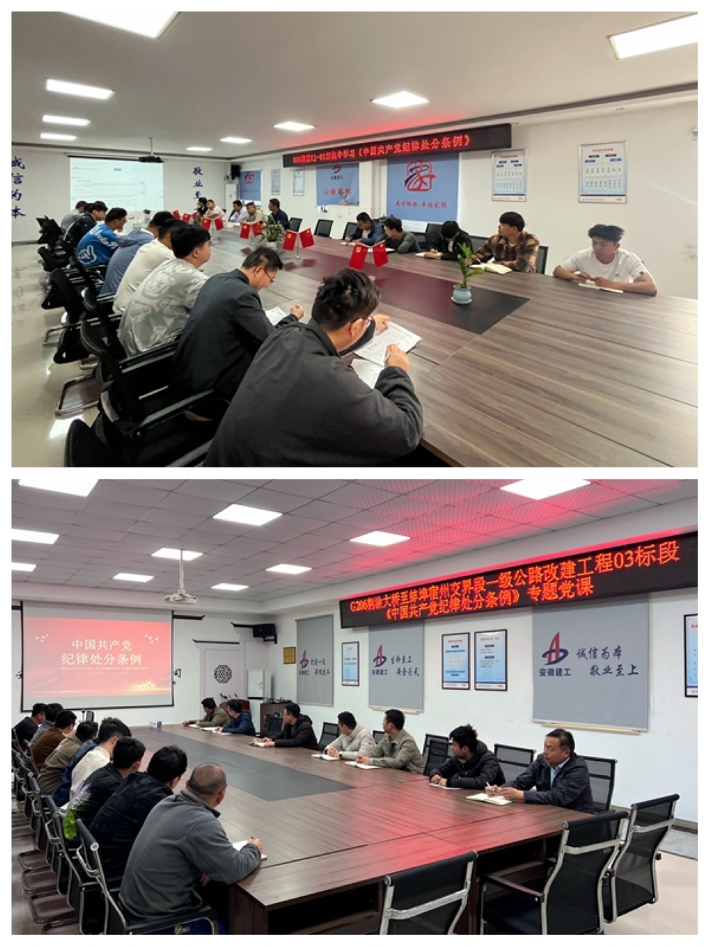 G36明蚌改擴建1標黨支部、G206-03標項目黨支部通過專題會議與黨課,深度解析學習《中國共產黨紀律處分條例》,將紀律內化于心、外化于行,促使紀律規(guī)范成為項目團隊日常行為的自覺遵循。