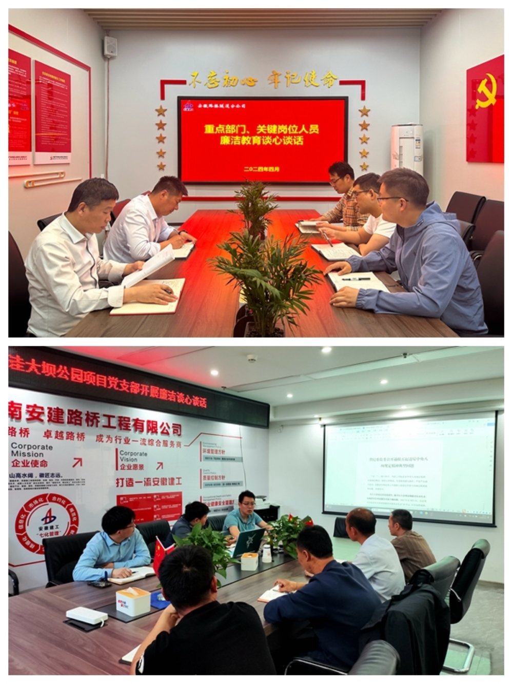 分公司機關(guān)黨支部、湯洼大壩公園項目黨支部組織開展談心談話廉潔教育,結(jié)合近年來中央紀委國家監(jiān)委通報的違紀違法典型案例,要求職工強化嚴于律己做人、清正廉潔做事的責任擔當,在工作和生活中守住廉潔自律“準繩”。