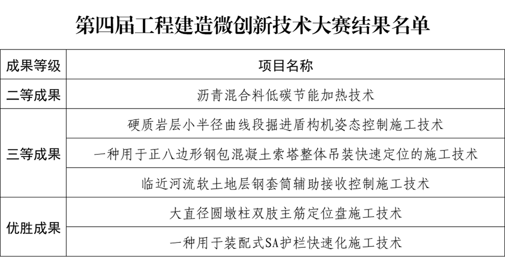 近日,中國施工企業(yè)管理協(xié)會公布第四屆工程建造微創(chuàng)新技術大賽結果,經(jīng)形式審查、初賽、復賽、決賽等環(huán)節(jié)的角逐,公司《瀝青混合料低碳節(jié)能加熱技術》等6個項目分別榮獲二等成果、三等成果和優(yōu)勝成果。