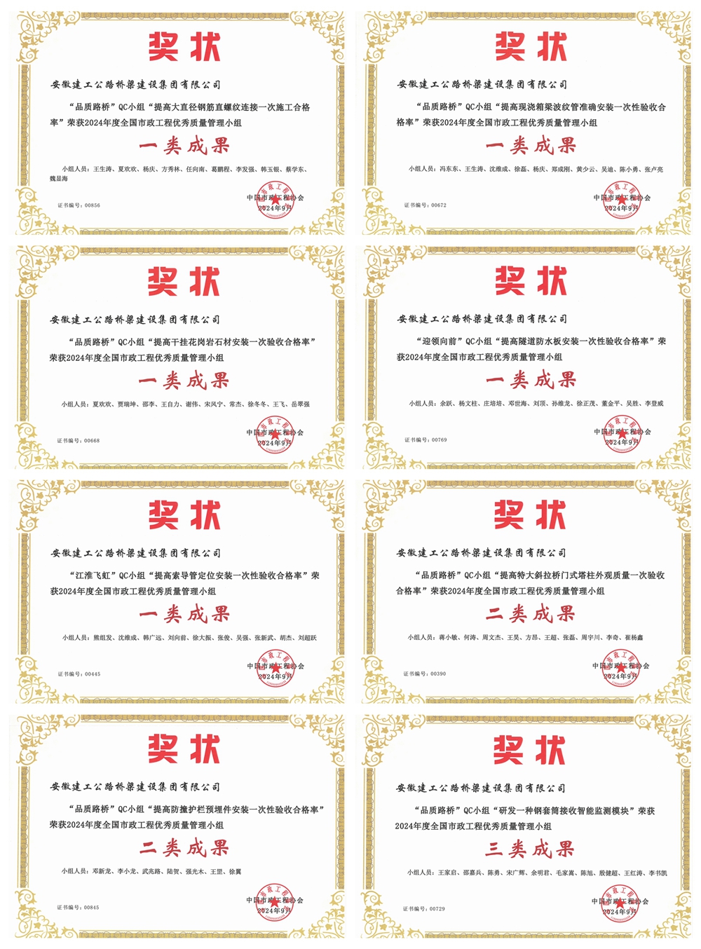 近日,中國(guó)市政工程協(xié)會(huì)正式公布了2024年度全國(guó)市政工程優(yōu)秀質(zhì)量管理小組名單,公司8項(xiàng)QC成果脫穎而出,榮獲全國(guó)QC成果一等獎(jiǎng)5項(xiàng)、二等獎(jiǎng)2項(xiàng)、三等獎(jiǎng)1項(xiàng)。