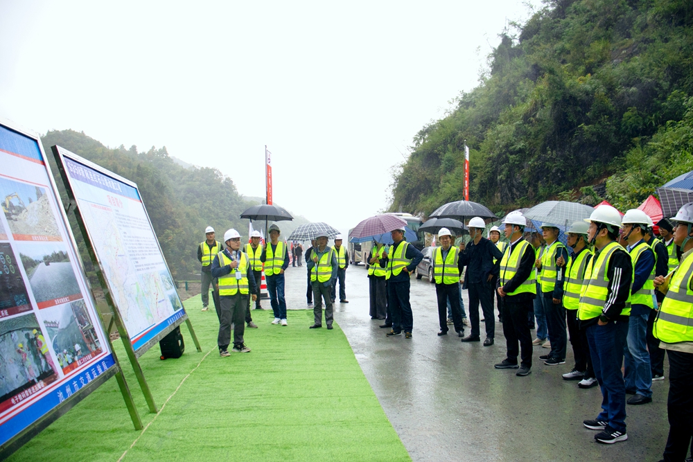 在古嶺隧道施工現(xiàn)場(chǎng),項(xiàng)目負(fù)責(zé)人向觀摩人員介紹了項(xiàng)目概況及現(xiàn)場(chǎng)施工進(jìn)展,并圍繞四新技術(shù)應(yīng)用、安全生產(chǎn)管理、隧道標(biāo)準(zhǔn)化施工等方面作了經(jīng)驗(yàn)分享。