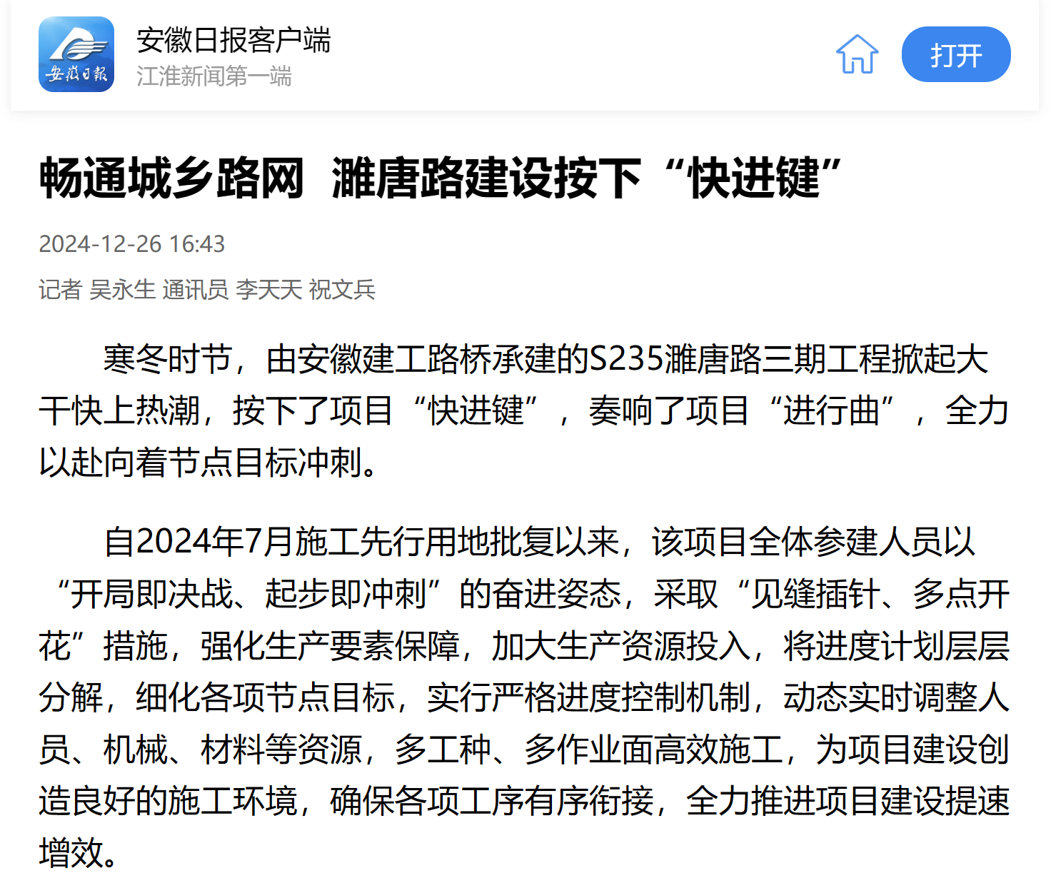 【名媒聚焦】安徽日報(bào)客戶端:暢通城鄉(xiāng)路網(wǎng) S235濉唐路三期項(xiàng)目建設(shè)按下“快進(jìn)鍵”