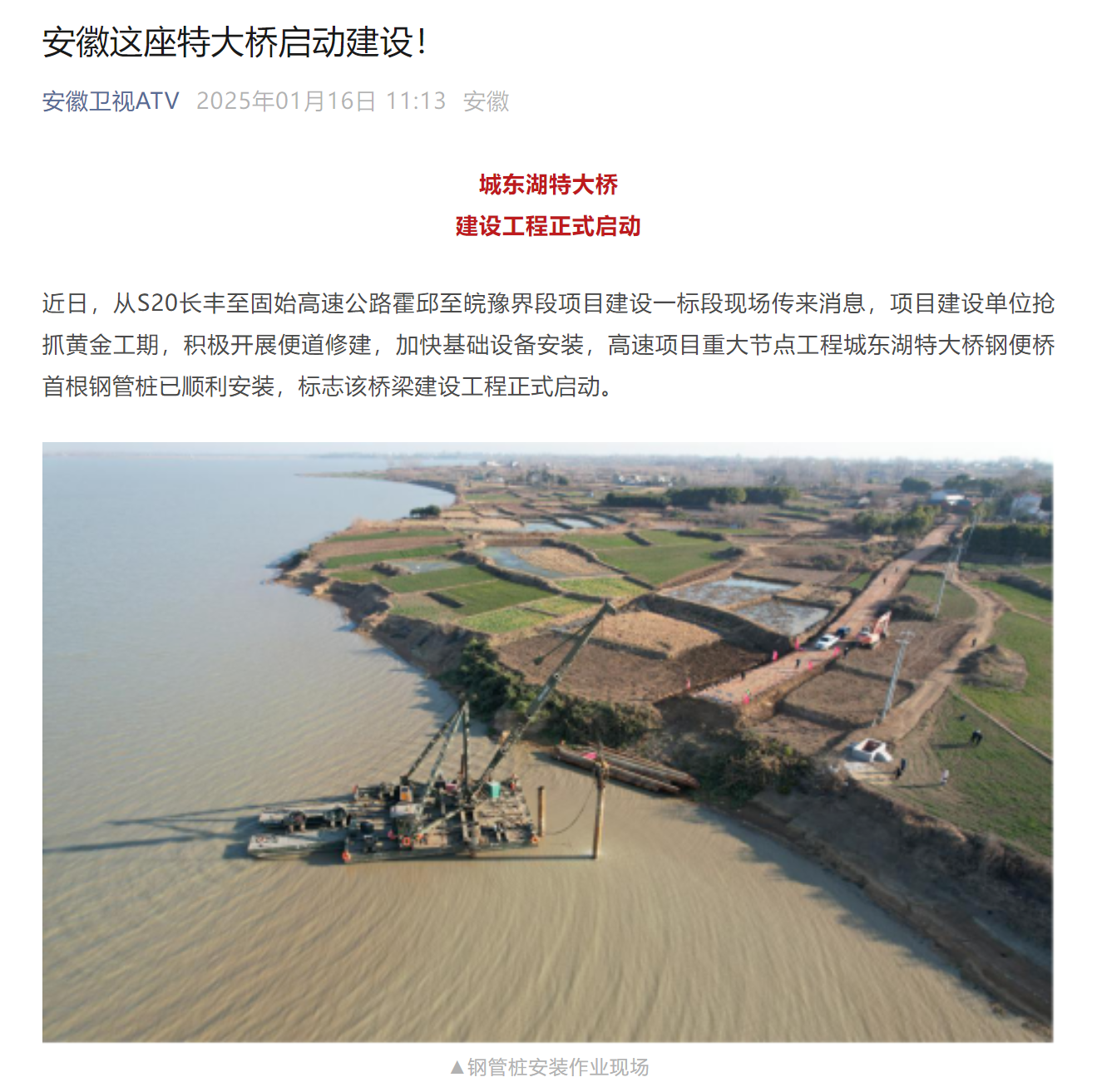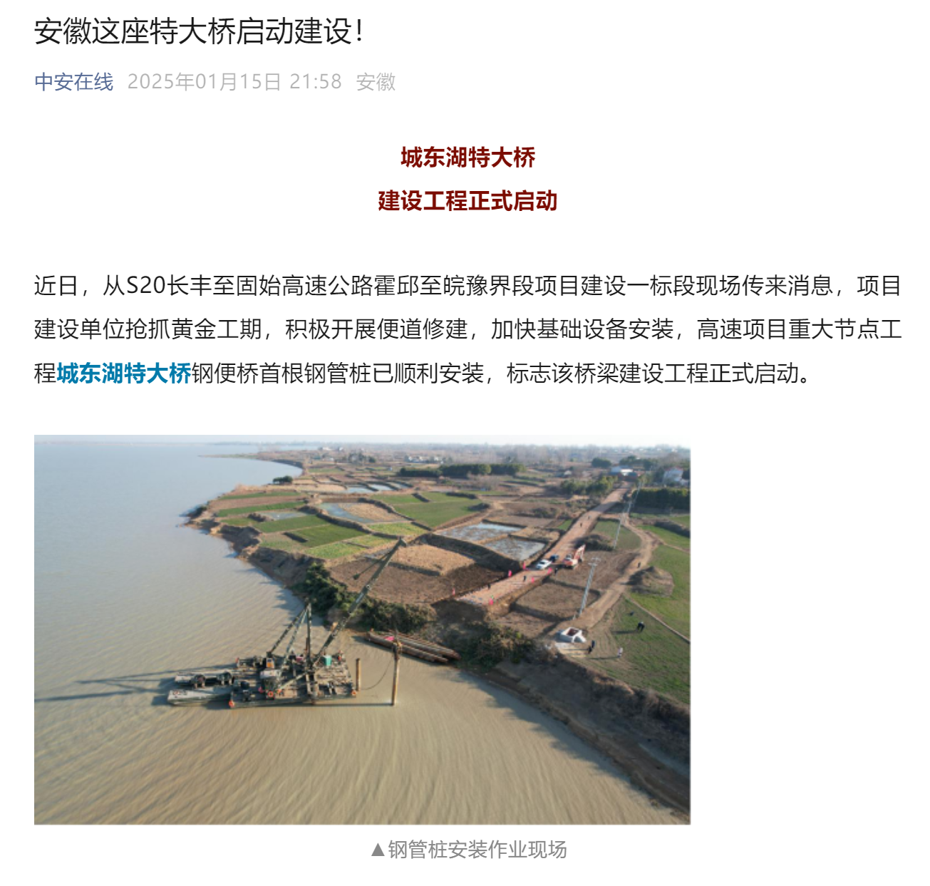 近日,從S20長豐至固始高速公路霍邱至皖豫界段項目建設(shè)一標段現(xiàn)場傳來消息,項目建設(shè)單位搶抓黃金工期,積極開展便道修建,加快基礎(chǔ)設(shè)備安裝,高速項目重大節(jié)點工程城東湖特大橋鋼便橋首根鋼管樁已順利安裝,標志該橋梁建設(shè)工程正式啟動。