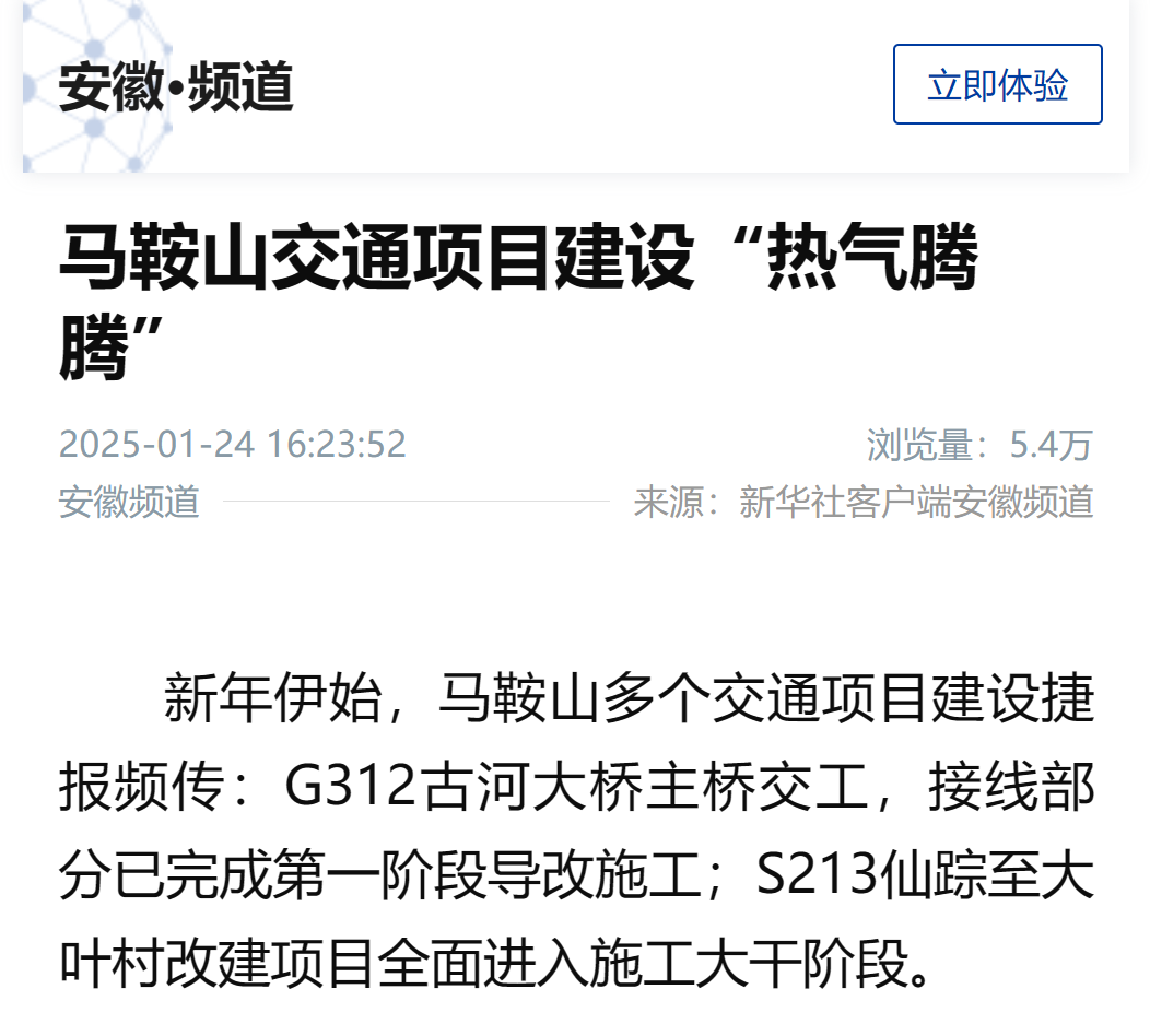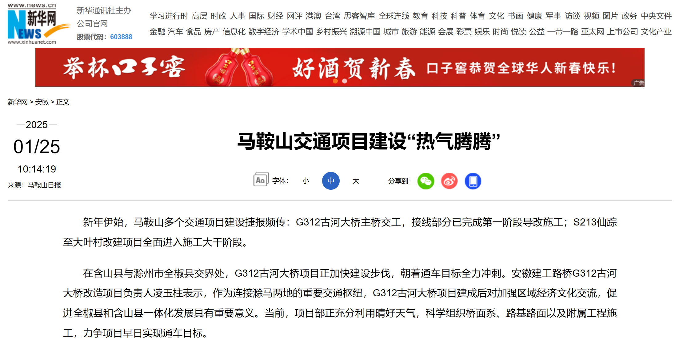 新年伊始,馬鞍山多個交通項(xiàng)目建設(shè)捷報(bào)頻傳:G312古河大橋主橋交工,接線部分已完成第一階段導(dǎo)改施工;S213仙蹤至大葉村改建項(xiàng)目全面進(jìn)入施工大干階段。