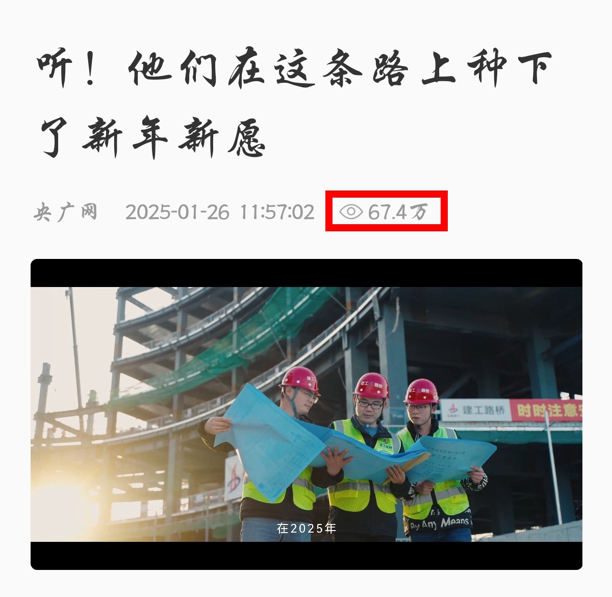 近日,由安徽建工路橋、央廣網(wǎng)聯(lián)合策劃拍攝的新春微視頻《新年新愿》在央廣網(wǎng)發(fā)布,全網(wǎng)累計瀏覽量已達500萬人次。讓我們跟隨他們的新年新愿,看一看一條條道路串起的好景好業(yè)好生活。
