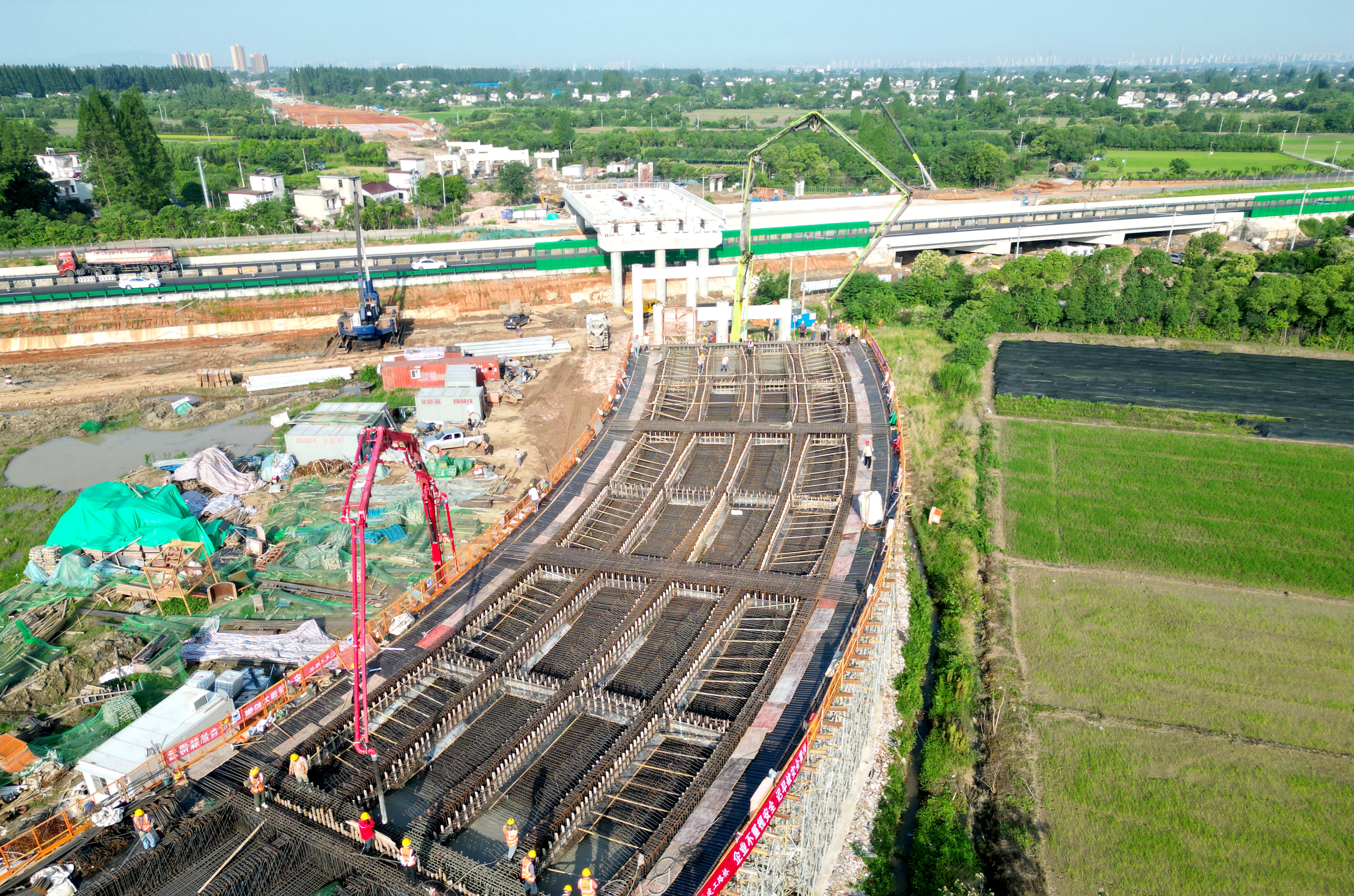 面對(duì)梅雨季節(jié)導(dǎo)致的施工便道通行不暢與地方協(xié)調(diào)壓力,項(xiàng)目部超前謀劃,完善施工方案,在交叉路口布置安全防護(hù)并全程值守,同時(shí)在施工便道各個(gè)通行困難地點(diǎn)安排機(jī)械鋪設(shè)鋼板,保證罐車按時(shí)抵達(dá)澆筑點(diǎn)。澆筑過(guò)程中嚴(yán)格把控現(xiàn)場(chǎng)工序質(zhì)量,加強(qiáng)現(xiàn)場(chǎng)盯控管理,為首件現(xiàn)澆箱梁的成功澆筑提供堅(jiān)實(shí)保障。