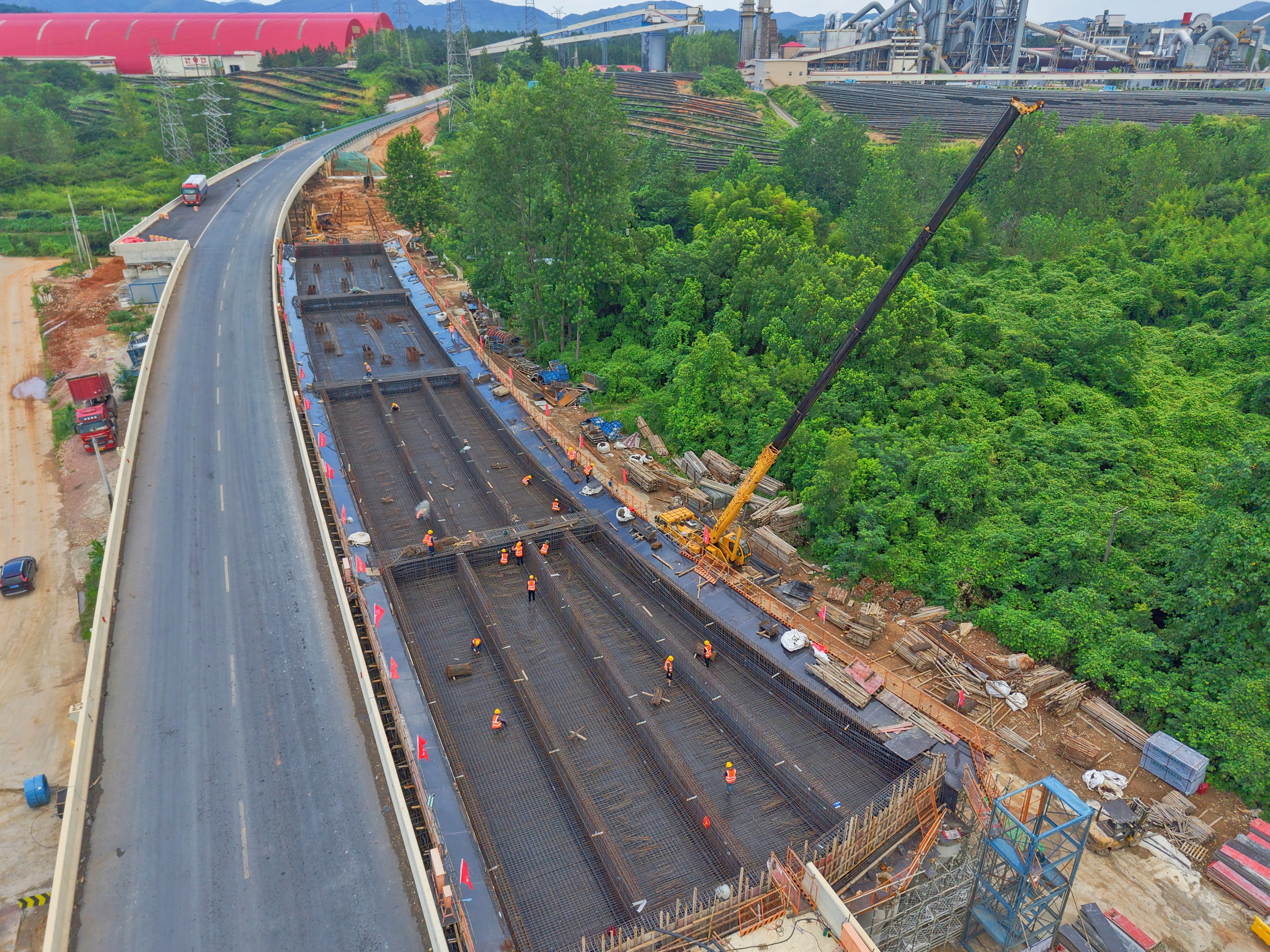 面對“邊施工、邊通車”的特殊施工環(huán)境,項目團(tuán)隊堅持“既要保進(jìn)度,更要保暢通”的原則,采取半幅交替施工模式,將施工區(qū)域劃分為若干個作業(yè)斷面,同步推進(jìn)橋梁現(xiàn)澆、瀝青面層攤鋪等關(guān)鍵工序。王超介紹,目前全線路基工程已完成95%,全線預(yù)制梁板橋施工也已全部完成。作為控制性工程,水東四號橋施工進(jìn)展順利,目前已完成約85%的工程量,正在進(jìn)行右幅第五聯(lián)鋼筋綁扎及第六聯(lián)樁基施工作業(yè)。