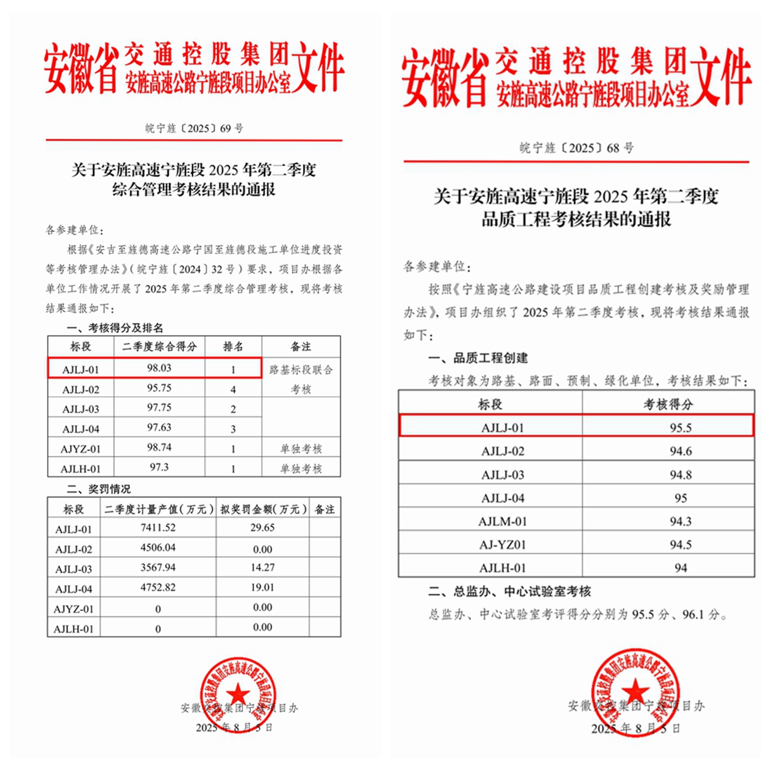 近日,安旌高速寧旌段辦公室公布了2025年第二季度綜合管理考核及品質(zhì)工程創(chuàng)建考核結(jié)果,公司承建的寧旌高速路基1標在兩項考核中均獲得施工單位“第一名”。