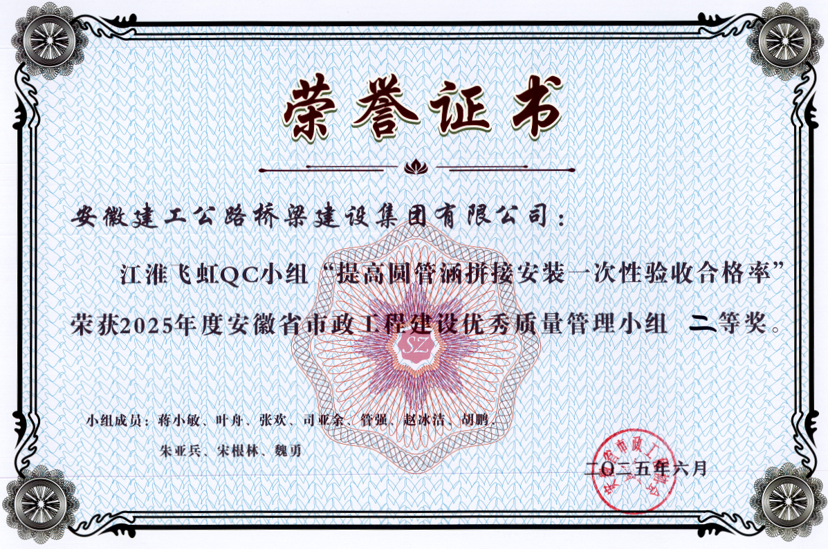 針對(duì)圓管涵等小結(jié)構(gòu)物外觀質(zhì)量通病,項(xiàng)目部成立“江淮飛虹”QC小組,聚焦混凝土質(zhì)量、模板工藝、振搗操作及養(yǎng)護(hù)管理等環(huán)節(jié)展開(kāi)技術(shù)攻關(guān)。其課題《提高圓管涵拼接安裝一次性驗(yàn)收合格率》顯著提升了施工進(jìn)度與實(shí)體質(zhì)量,一次性驗(yàn)收通過(guò)省去了整改、復(fù)檢時(shí)間,確保圓管涵施工按計(jì)劃銜接后續(xù)工序,助力項(xiàng)目率先完成全線(xiàn)40道圓管涵施工;合格的拼接安裝減少了后期漏水、沉降、結(jié)構(gòu)開(kāi)裂等隱患,提升了工程耐久性和質(zhì)量穩(wěn)定性。該成果有效降低了成本損耗、保障了工期推進(jìn),榮獲2025年度安徽省工程建設(shè)質(zhì)量與安全協(xié)會(huì)QC活動(dòng)一等獎(jiǎng)及安徽省市政工程建設(shè)優(yōu)秀質(zhì)量管理小組二等獎(jiǎng)。