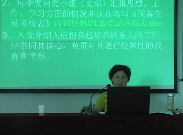 黨委辦公室主任劉昀主持了培訓(xùn)會(huì),并就發(fā)展黨員工作程序,作了專題講座。劉主任通過PPT課件,系統(tǒng)的介紹了黨員發(fā)展程序,從制訂發(fā)展黨員的工作計(jì)劃開始,到預(yù)備黨員轉(zhuǎn)正、整個(gè)入黨材料存入個(gè)人檔案,以及最后的責(zé)任追究都作了詳細(xì)介紹,讓與會(huì)人員對(duì)發(fā)展黨員工作的程序有了清楚的了解。隨后,大家一起觀看了《欲之害——段義和腐敗案件警示錄》。專題片揭露了段義和利用職務(wù)便利大肆索賄的腐敗行徑,深刻揭示了腐化墮落的思想根源和蛻變軌跡。通過觀看警示教育片,使大家接受了一次深刻的思想教育和精神洗禮,進(jìn)一步認(rèn)識(shí)了在新形式下反腐倡廉建設(shè)的重要性。