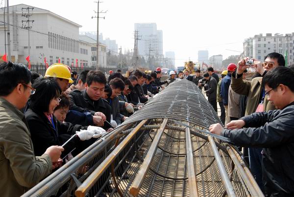項(xiàng)目辦負(fù)責(zé)人向?qū)W員們簡單介紹了工程概況。學(xué)員們?cè)诠と藥煾档闹笇?dǎo)下,紛紛戴上手套、拿起工具,給已成型的樁基鋼筋籠綁扎鋼絲,親身體驗(yàn)了建設(shè)者的辛勞。學(xué)員們虛心向工人師傅學(xué)習(xí),緊圍著鋼筋籠,一邊認(rèn)真扎絲,一邊相互交流,探討綁扎技巧。在學(xué)員們的巧手下,兩個(gè)鋼筋籠很快完成綁扎,將用于晚間施工。