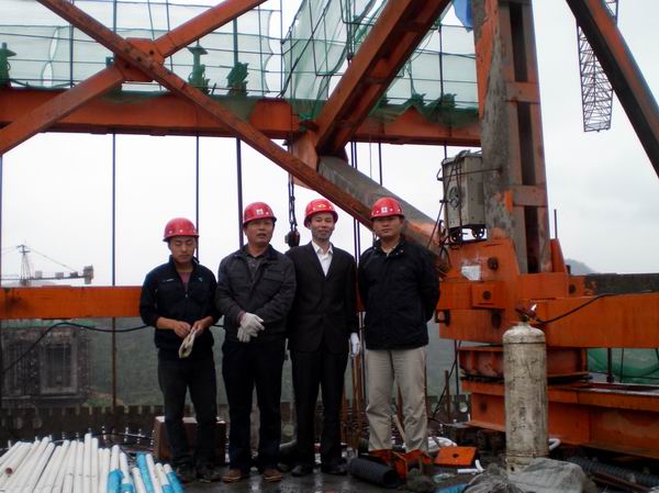 31日上午,在經過整夜大雨后,天空依舊飄散著涼涼的細雨。盛總一行在項目總工胡學祥和項目副經理張林的陪同下,對巖子腳大橋進行了認真的檢查,并冒雨登上高達74米的4號主墩施工現場。他就進行到掛藍施工階段的大橋與項目人員展開討論,對施工現場存在的施工難點和注意事項一一指出。盛總對項目部克服種種困難加緊施工作出了肯定。