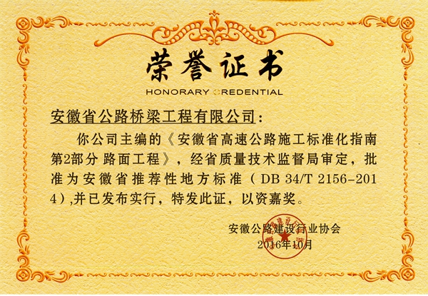 會(huì)上,省交通廳對(duì)在系列指南編寫工作中作出貢獻(xiàn)的單位和個(gè)人給予了表彰并頒發(fā)榮譽(yù)證書。公司主編的 《安徽省高速公路施工標(biāo)準(zhǔn)化指南  第2部分路面工程》(DB 34/T 2156-2014)獲得表彰,并經(jīng)省質(zhì)量技術(shù)監(jiān)督局審定批準(zhǔn)為安徽省推薦性地方標(biāo)準(zhǔn),發(fā)布實(shí)行。