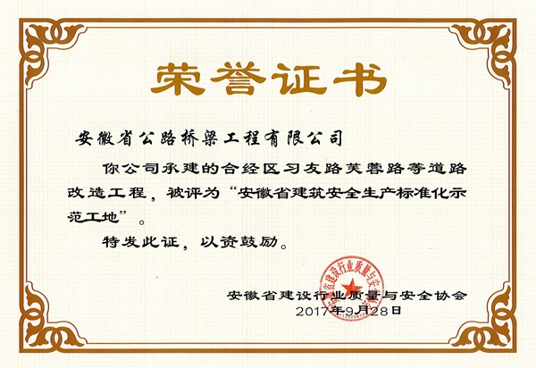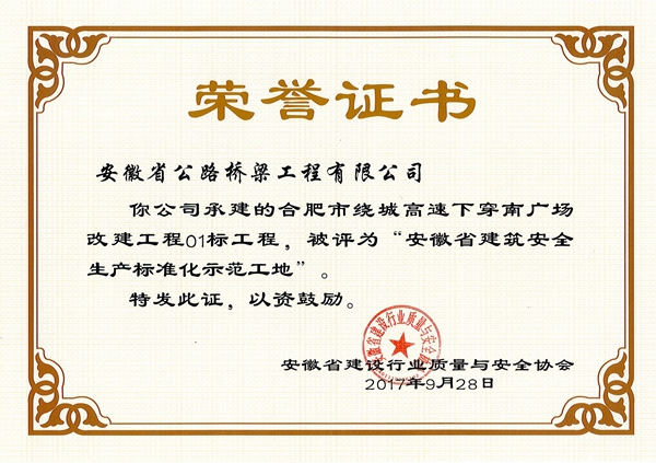 近日,從安徽省建設行業(yè)質量與安全協(xié)會獲悉,由公司承建的合肥市繞城高速下穿南廣場改建工程01標、合經區(qū)習友路芙蓉路等道路改造工程兩個項目榮獲“安徽省建筑安全生產標準化示范工地”稱號。