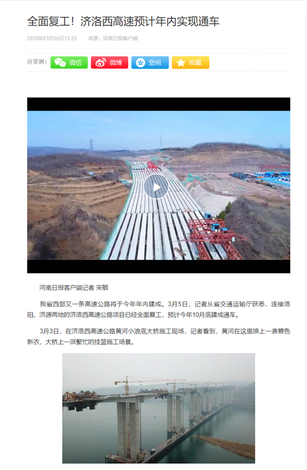 3月4日,公司承建的巢湖亞父路項目裕溪河大橋復工場景出現(xiàn)在人民網(wǎng)首頁,并刊文指出,為奪回疫情造成的停工損失,項目部嚴格落實防疫和生產(chǎn)要求,在保證安全質量的前提下,加班加點趕施工進度,確保大橋按期建成通車。河南衛(wèi)視、鳳凰網(wǎng)等多家媒體記者走進公司承建的濟洛西高速黃河特大橋項目施工現(xiàn)場,實地采訪項目復工復產(chǎn)情況,并在中國網(wǎng)、河南日報客戶端、大河網(wǎng)進行了登載。安徽網(wǎng)聚焦G318池州至殷匯段改建工程復工建設,《今日宣州》以《按下交通建設“快進鍵”》為題專題報道了公司宣城PPP項目在疫情防控形勢逐漸向好的態(tài)勢下,搶抓建設黃金期,優(yōu)化調整復工隊伍和施工組織計劃,把因疫情耽誤的工期搶回來,確保項目如期完工,開啟了復工建設趕進度模式。