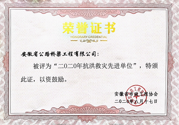 公司榮獲安徽省市政工程協(xié)會“2020年抗洪救災先進單位”