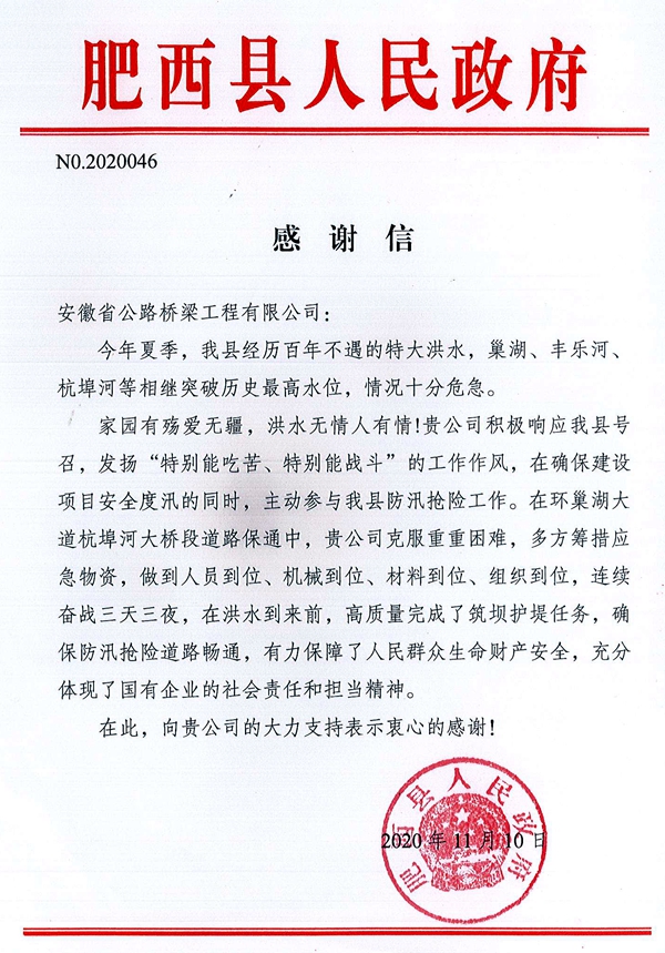 11月10日,肥西縣人民政府給公司送來一封感謝信,高度贊揚公司在防汛搶險工作中的突出貢獻和國企擔(dān)當(dāng)精神,并向公司致以衷心感謝。