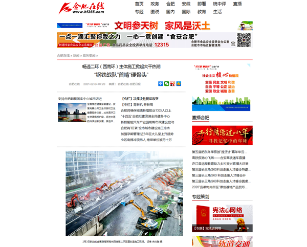 人民網(wǎng)【新春走基層】專欄報道了該項目大年三十工地不打烊,參建人員持續(xù)奮戰(zhàn)在施工一線。中國日報海外版《End of the road》、合肥日報《“鋼鐵戰(zhàn)隊”首啃“硬骨頭”》報道了公司第二次對老舊匝道橋拆除工作的場景。安徽衛(wèi)視超級新聞場等媒體以《“鋼鐵戰(zhàn)士”組隊 南二環(huán)改造工程第二階段施工啟動》報道了南二環(huán)改造工程順利進入第二階段施工節(jié)點的訊息。學(xué)習(xí)強國合肥學(xué)習(xí)平臺、澎湃新聞以《合肥:暢通南二環(huán) 鉚足干勁 大干正酣》為題,合肥新聞聯(lián)播以《“步履不停”保暢通 建設(shè)按下“快進鍵”》《過年堅守南二環(huán) 來年道路早暢通》為題,報道了春節(jié)期間該項目施工現(xiàn)場干出的“加速度”。抖音等自媒體平臺以短視頻形式展示了數(shù)十臺機械同時作業(yè)的震撼場面,關(guān)注熱度超過3百萬,安徽路橋速度得到合肥市民的再次點贊。