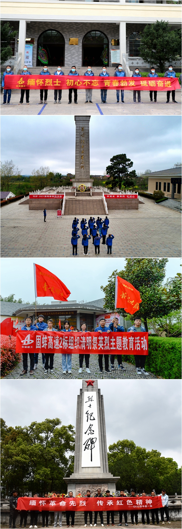 在紅色江西,公司承建的吉康改擴(kuò)建C1標(biāo)項(xiàng)目黨員及團(tuán)員青年前往遂川縣革命烈士紀(jì)念館,學(xué)習(xí)革命歷史,緬懷革命先烈,了解不同時期革命烈士的先進(jìn)事跡;滁河大橋項(xiàng)目黨支部在全椒周家崗革命烈士陵園開展“緬懷革命先烈,傳承民族精神”為主題的清明祭掃活動,向烈士紀(jì)念碑敬獻(xiàn)花籃,寄托哀思。固蚌高速2標(biāo)項(xiàng)目部黨支部前往蚌埠渡江戰(zhàn)役總前委舊址紀(jì)念館參觀學(xué)習(xí),開展以“學(xué)習(xí)黨史、不忘初心、牢記使命”為主題的教育活動; G530查橋至牛磯段一標(biāo)組織員工前往東至縣烈士陵園開展“緬懷革命先烈、傳承紅色精神”清明祭掃活動;馬鞍山S247項(xiàng)目組織觀看《你記得我,我就活著》主題短片,學(xué)習(xí)黨史精講課程---《永不叛黨》,并積極開展研討交流。