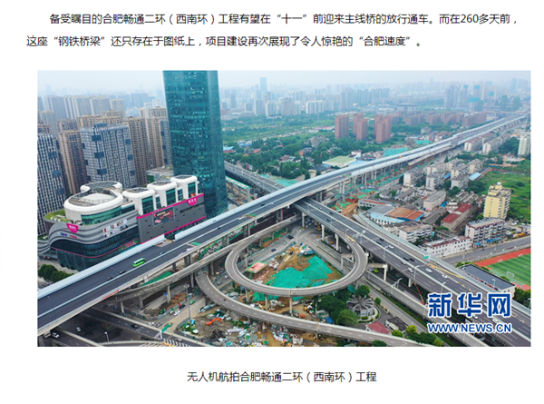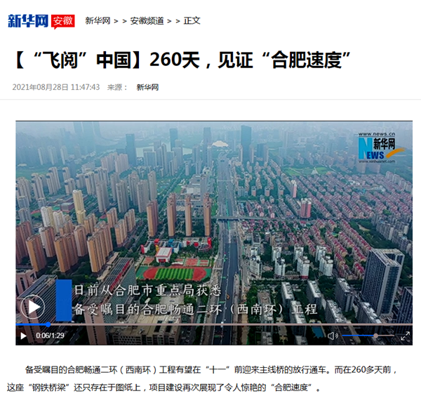 8月28日,國家級主流媒體再次聚焦公司承建的重點工程建設(shè),《新華網(wǎng)》以《“飛閱”中國260天 見證“合肥速度”》為題,報道了公司承建的暢通南二環(huán)(西南環(huán))項目建設(shè)進(jìn)展情況。